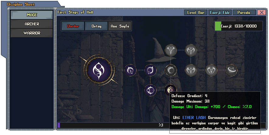 Ayrıca oyundan çıktığınızda veya öldüğünüzde disiplin deaktif olur. Enerji harcayarak tekrardan ilgili disiplini aktif etmeniz gerekmektedir.