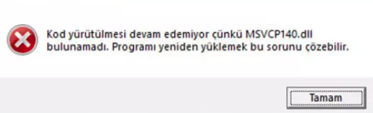"Kod yürütülmesi devam edemiyor çünkü MSVCP140.dll bulunamadı. Programı yeniden yüklemek bu sorunu çözebilir."
