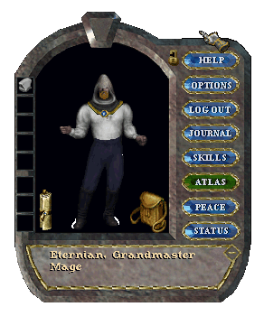 Paperdoll, ALT + P tuşlarına basılarak ya da oyun içinde karakterinize çift tıklanarak açılabilir. Burada Help, Options, Log Out, Journal, Skills, Atlas, War/Peace ve Status dahil olmak üzere ana menülerin bir çoğunu bulabilirsiniz.