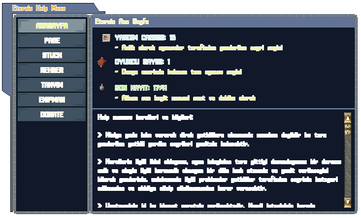 Paperdoll içindeki Help butonuna tıklayarak Eternia hakkında bazı bilgilere ve menülere ulaşabilirsiniz.