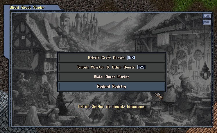 Quest sistemi şehir bazlı çalışmaktadır. Örneğin Alchemy görevleri tüm şehirlerde bulunur ancak her şehir için ayrı bir görev havuzu vardır. Yani Britain’daki Alchemy görevi ile Moonglow’daki Alchemy görevi birbirinden bağımsızdır ve ayrı ayrı tamamlanır.