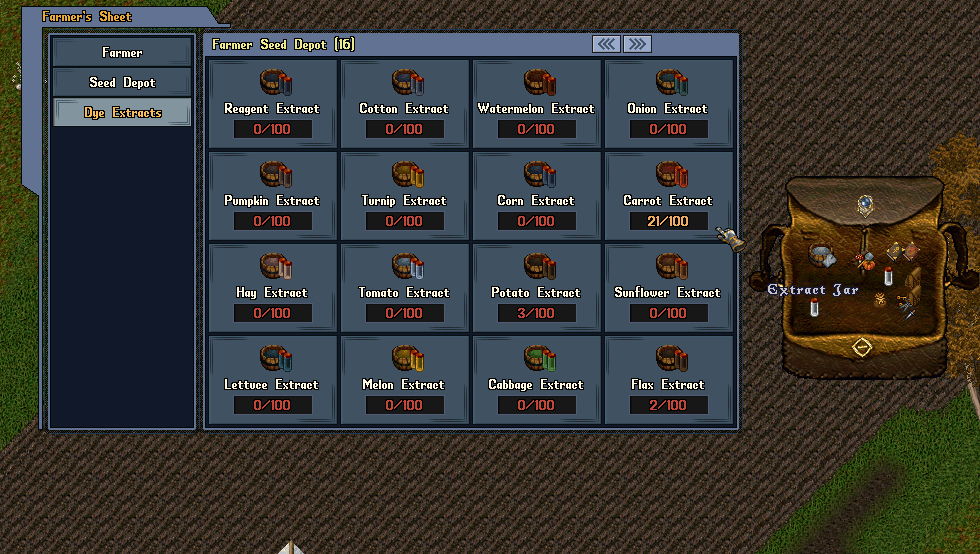 Hasat sonrası rastgele tohum ve boya özütü kazanabilirsiniz. Bunlar Farmer's Sheet panelindeki deponuzda saklanır. Boya özütlerini rare, leather veya furniture dye yapımı için kullanabilirsiniz.